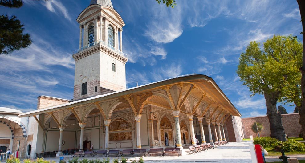 Das Tor der Glückseligkeit wurde auch Ak Agalar Kapisi (Tor der Weißen Eunuchen) genannt. Wir durchschreiten es und gelangen in den Dritten Hof, der die privaten Gemächer des Sultans beherbergt. Niemand durfte dieses Tor ohne die Erlaubnis des Sultans passieren. Vor diesem Tor wurden Thronbesteigungsfeierlichkeiten und religiöse Zeremonien abgehalten. Heerführer, die in den Krieg zogen, bekamen hier in einem feierlichen Akt das Banner des Propheten überreicht. Gleich gegenüber sehen Sie den beidseits von Springbrunnen flankierten Audienzsaal.